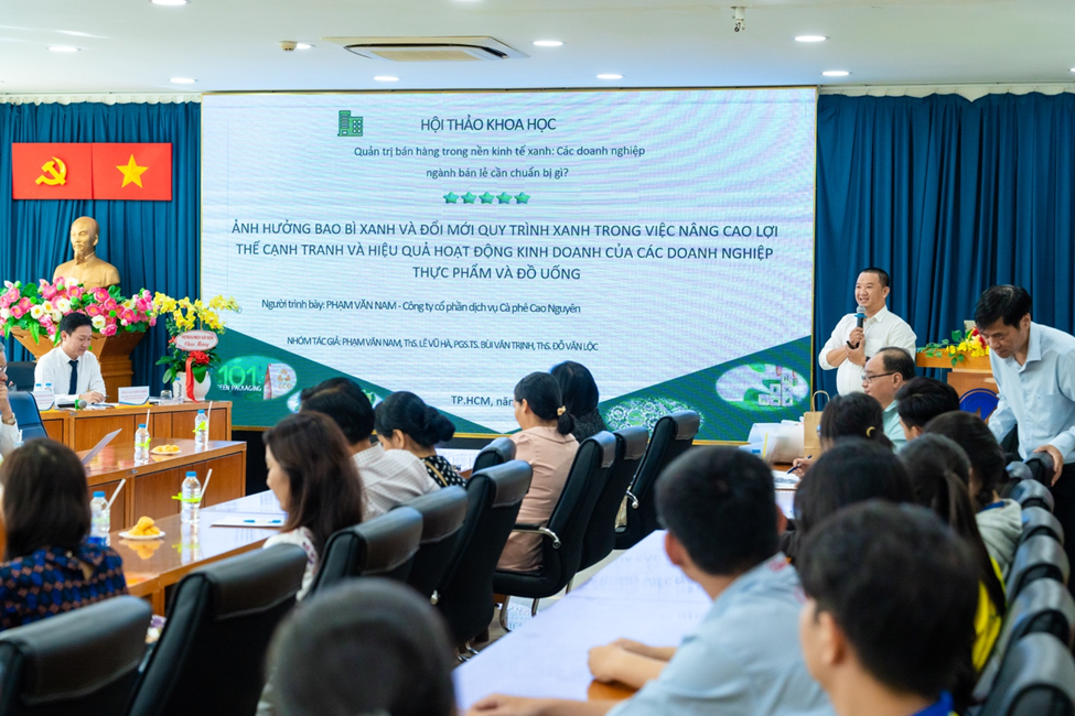 The seminar featured two highly impactful presentations that enriched discussions by providing in-depth perspectives on critical issues within the green economy. These presentations explored emerging trends, identified opportunities and challenges, and examined strategic responses for retail businesses. One notable presentation, titled "The Impact of Green Packaging and Green Process Innovation on Enhancing Competitive Advantage and Business Performance in Food and Beverage Enterprises," was delivered by Mr. Phạm Văn Năm from Highlands Coffee. This presentation offered valuable insights into how initiatives in green packaging and process innovation can significantly enhance competitive advantage and improve operational performance within the food and beverage industry..